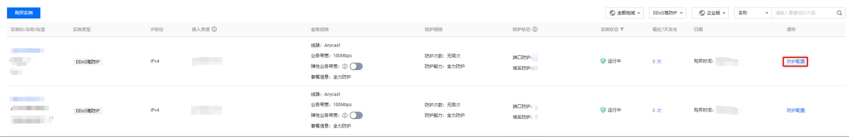 2. 选择对应 DDoS 高防 IP(境外企业版)实例,单击防护配置。