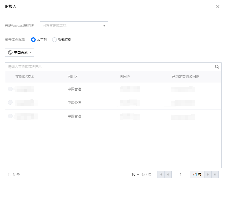 3. 在 IP 接入页面,“关联 Anycast 高防 IP”处选择 DDoS 高防 IP(境外企业版)实例,单击确定,即可完成与云资源的绑定。