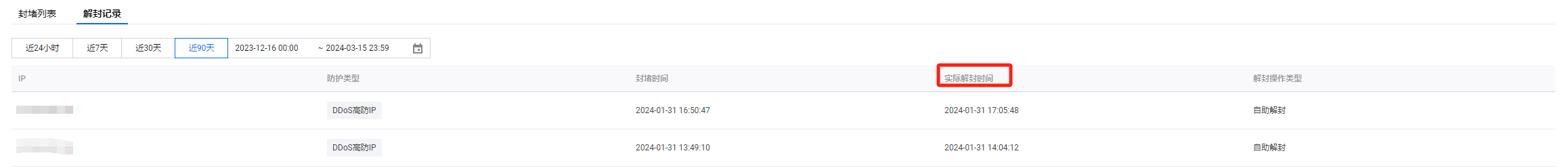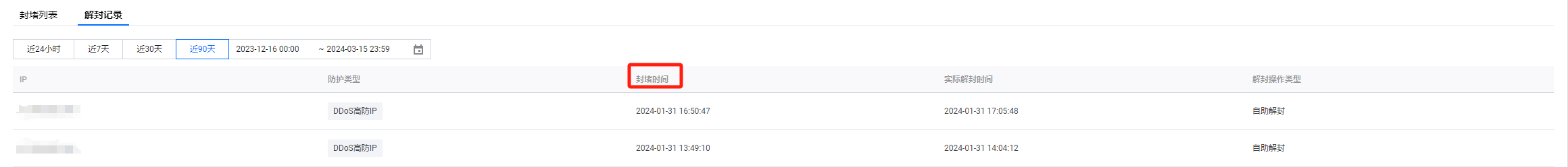 在解封记录页签,选择所需 IP 的所在行,可在“封堵时间”处,查看该 IP 的封堵时间。