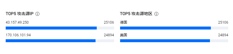 5. 在事件详情页面 “TOP5 展示”模块,可查看攻击源 IP TOP5 和攻击源地区TOP5,准确把握攻击源的详细情况便于精准防护策略的制定。
