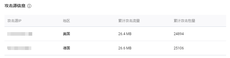 6. 在事件详情页面的攻击源信息模块,可查看该攻击时间段内攻击详情的随机采样数据,尽可能详细的展示出此次攻击的细节,主要包括攻击源 IP、地域、累计攻击流量、累计攻击包量。