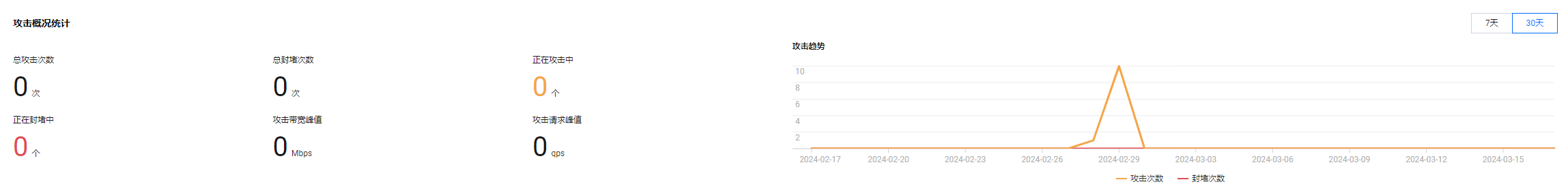 2. 在攻击概况统计模块中,可查看当前业务被攻击总次数、总封堵次数、正在攻击中、正在封堵中、攻击带宽峰值、攻击请求峰值。右侧可以查看7天/30天的攻击趋势。