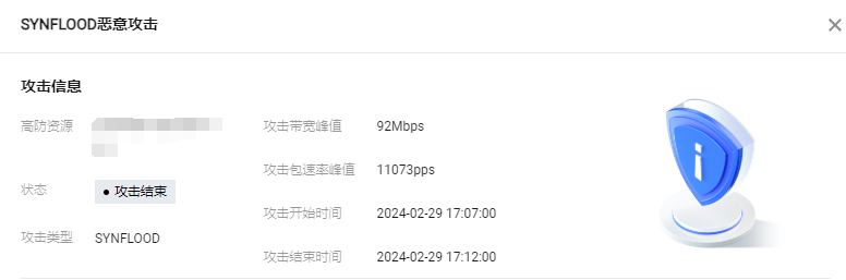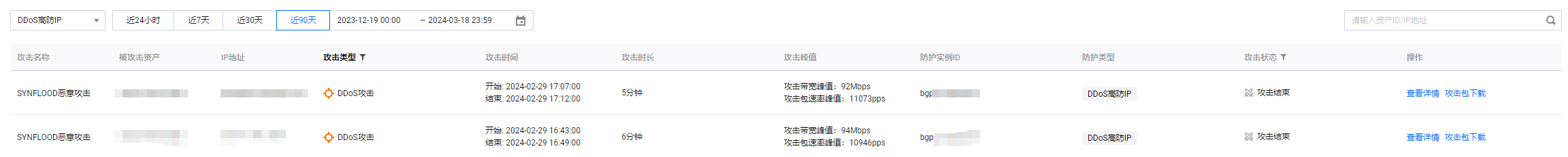 1. 在事件详情页面,可通过资产ID/IP地址,尽可能详细的展示出此次攻击的细节,主要包括攻击源名称、被攻击资产、IP 地址、攻击时间、攻击时长、攻击峰值、防护实例 ID、防护类型、攻击状态。