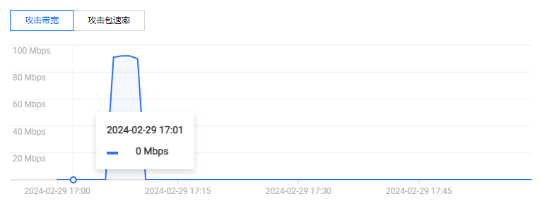 3. 在事件详情页面的攻击趋势模块,可查看网络攻击流量带宽或攻击包速率趋势。当遭受攻击时,在流量趋势图中可以明显看出攻击流量的峰值。
