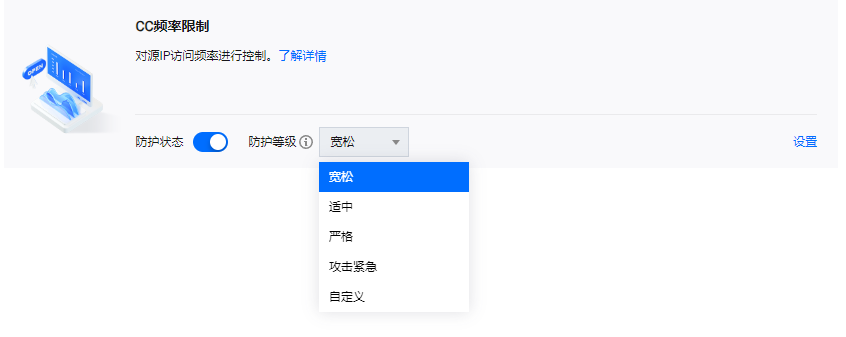 宽松等级 | 此等级下的 CC 防护策略较为宽松,可能会存在少部分异常请求透传的风险。 注意:当发生攻击时,可切换防护等级进行防护。也可以配置自定义 CC 频率限制策略进行防护。 |