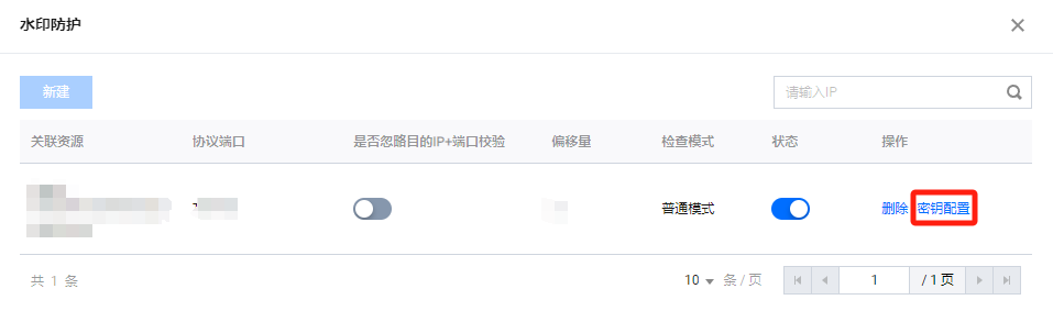 5. 新建完成后,水印防护列表将新增了一条水印防护规则,可以在右侧操作列,单击配置密钥,可以查看和配置密钥。