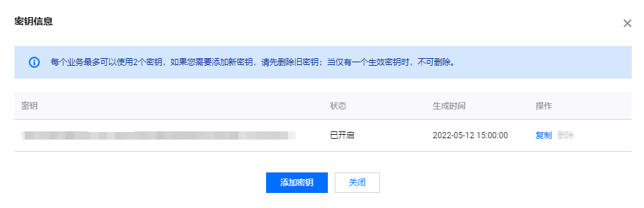 6. 在配置密钥的界面,用户可以查看或复制密钥,并支持添加或删除密钥,只有在两个密钥时可以删除一个密钥,最多只能有两个水印密钥。