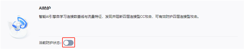 DDoS 高防支持智能 AI 防护功能。开启 AI 防护后,DDoS 高防将通过算法自主学习连接数基线与流量特征,自适应调整清洗策略,发现并阻断四层连接型 CC 攻击,提供最佳防御效果。