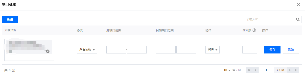 4. 在端口过滤页面,单击新建,创建端口过滤规则,根据需求,选择不同防护动作并填写相关字段,单击保存。