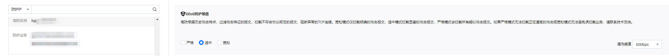 2. 在 DDoS 防护页面的左侧列表中,选中高防包/高防IP的 ID,如"bgp-00xxxxxx"。