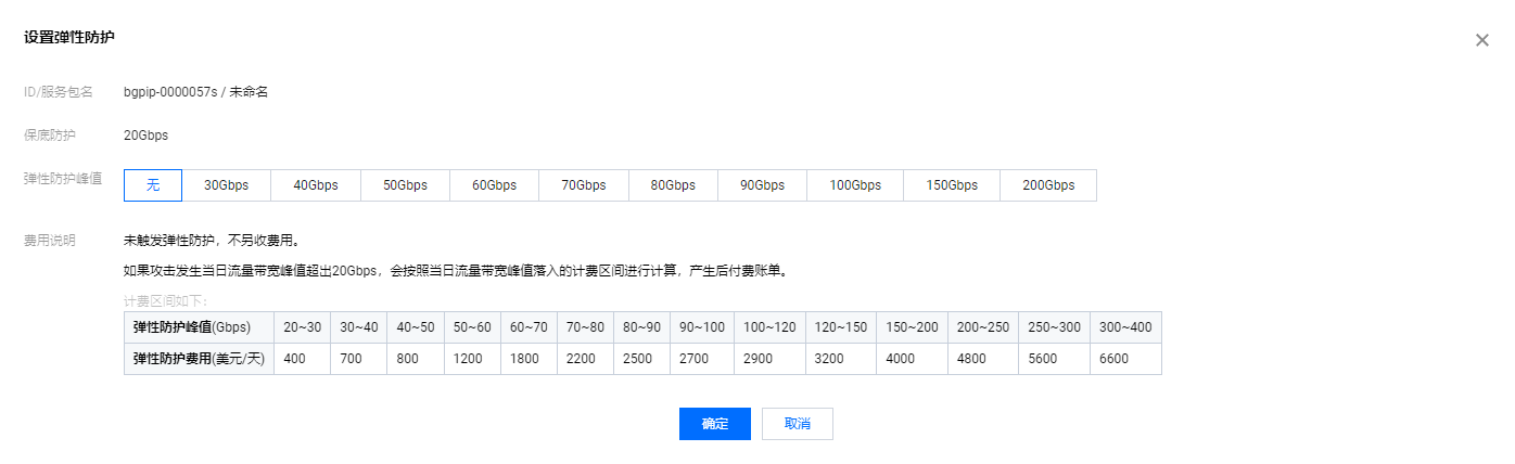 由于弹性防护峰值和费用受到不同地区以及不同版本的影响,实际弹性防护峰值和费用以控制台显示为准。