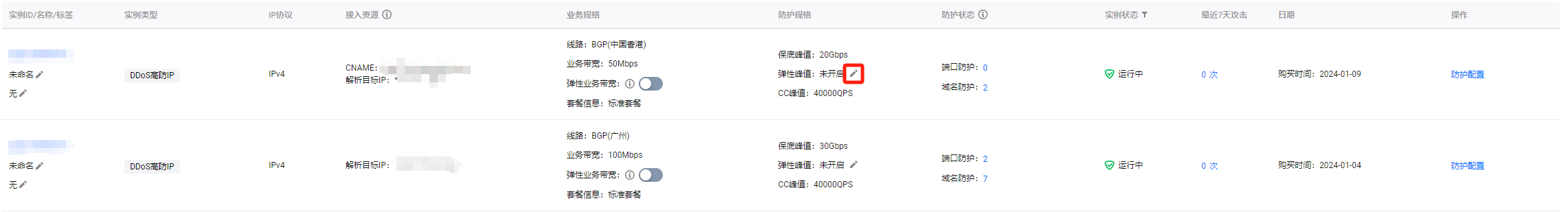 2. 在目标 DDoS 高防 IP 实例所在行的防护规格中,单击弹性峰值后