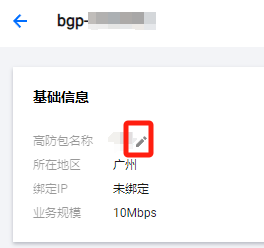 3. 在实例的基础信息页面中,单击高防包名称或高防 IP 名称右侧的,输入名称即可。 说明: