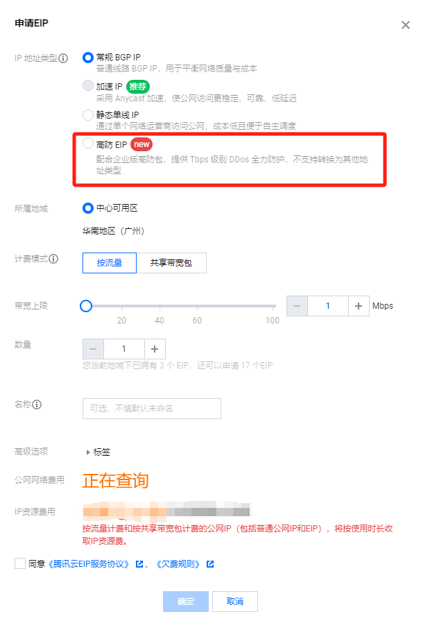 3. 在申请 EIP 窗口中,配置相关参数,单击确定,完成 EIP 的申请。