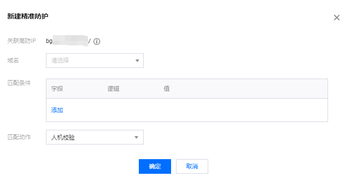 4.2 单击新建,创建精准防护规则,填写相关字段,填写完成后,单击确定即可。详细配置说明,请参见 精准防护。 注意:
