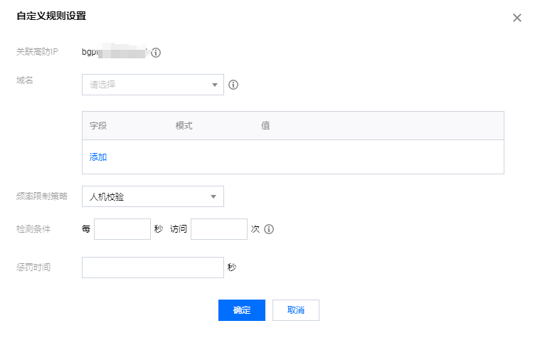5.2 单击新增规则,创建频率控制规则,填写相关字段,单击确定即可。详细配置说明,请参见 CC 频率限制。 注意: