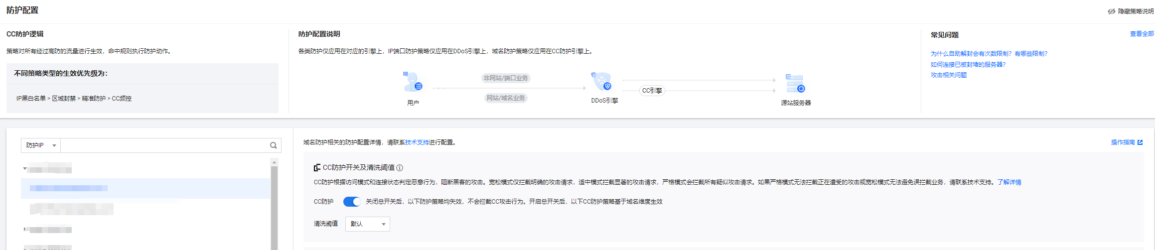 3. CC 防护开关及清洗阈值。在右侧选择 CC 防护开关及清洗阈值卡片,单击开启开关,并设置 CC 防护清洗阈值。 说明: