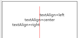 const ctx = wx.createCanvasContext('myCanvas')ctx.setStrokeStyle('red')ctx.moveTo(150, 20)ctx.lineTo(150, 170)ctx.stroke()ctx.setFontSize(15)ctx.setTextAlign('left')ctx.fillText('textAlign=left', 150, 60)ctx.setTextAlign('center')ctx.fillText('textAlign=center', 150, 80)ctx.setTextAlign('right')ctx.fillText('textAlign=right', 150, 100)ctx.draw()