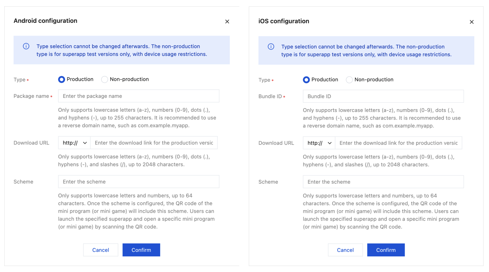 每个 superapp 只能添加1个生产 Package name/Bundle ID 和1个非生产的 Package name/Bundle ID。
