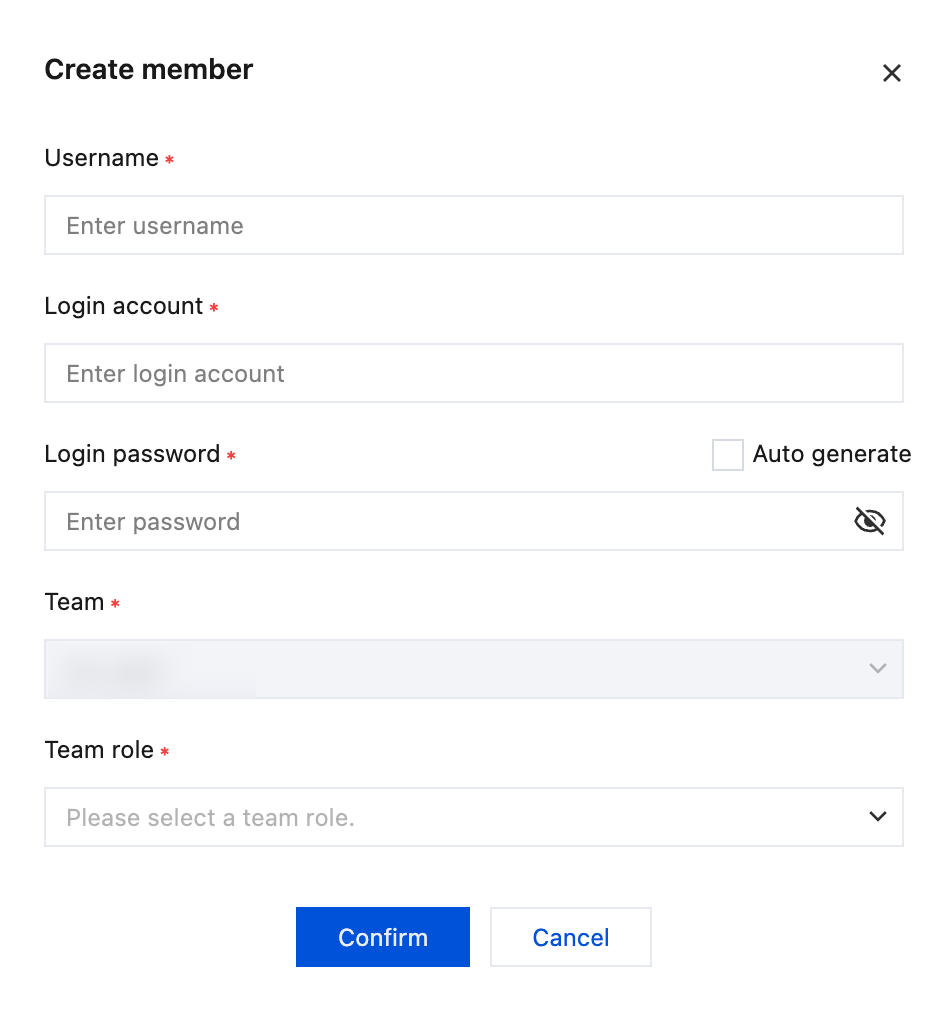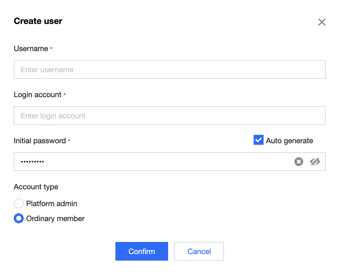 通过此方式新建的用户只能是平台的普通成员,管理员仍需填写用户名、登录账号、登录密码、所属团队和团队角色。