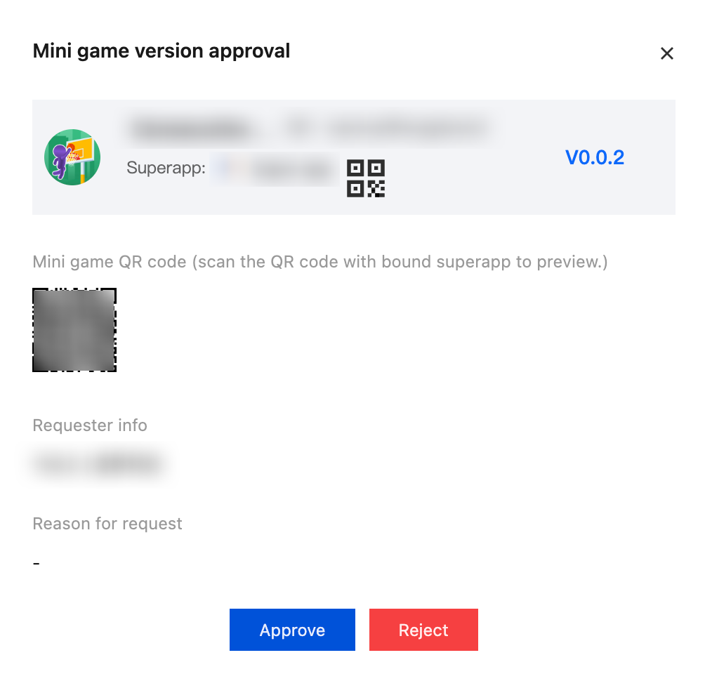 小程序团队在提交小程序的发布审批后,应用团队管理员或审核人员,在 发布审核-待处理 列表会收到审批信息,此时可对小程序版本发布进行审批。 点击列表操作栏中的"审核",查看小程序或小游戏提交审核的版本信息,可在此处使用 superapp(需要已经完成 SDK 接入流程)扫描二维码体验小程序或小游戏的功能,并决定通过或驳回小程序或小游戏的版本发布申请。