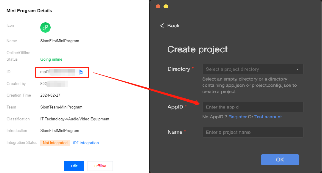 1. 完成接入应用、创建小程序、小程序绑定应用这三个步骤后,开发者可以在 IDE 进行新建项目操作(注意此处 AppID 为小程序 id,可下拉选择已经在控制台创建好的小程序,无需手动输入)。
