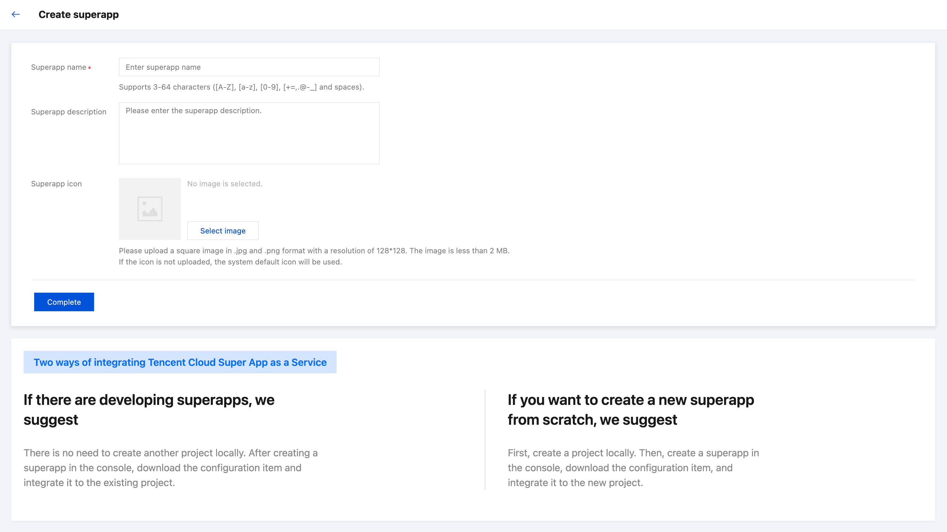 Superapp 是小程序或小游戏运行的宿主,由应用管理员或应用高级开发者在 应用管理-应用主页 处创建,创建 superapp 后会生成配置文件,将配置文件下载并导入到代码工程中,完成小程序容器 SDK 集成。 必填信息: