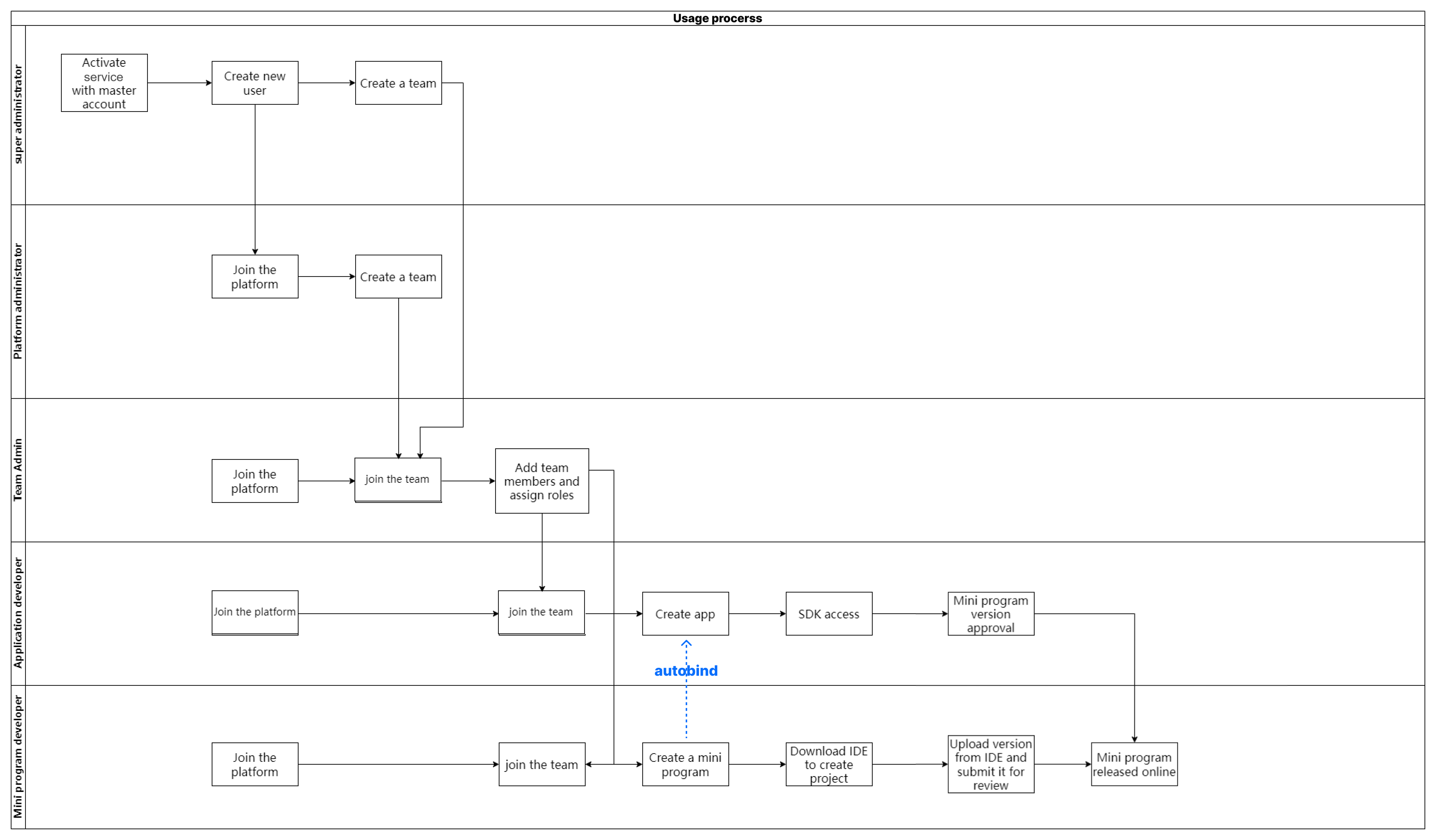 超级应用服务(Super App as a Service)为企业提供小程序开发、测试、发布、运营和应用接入小程序容器的技术能力,下图展示了从小程序平台开通到小程序在宿主应用中发布上线全流程。