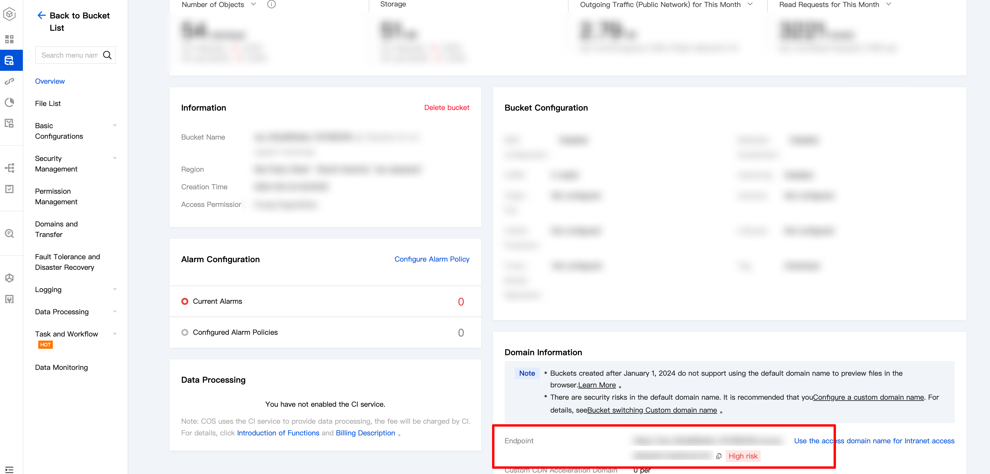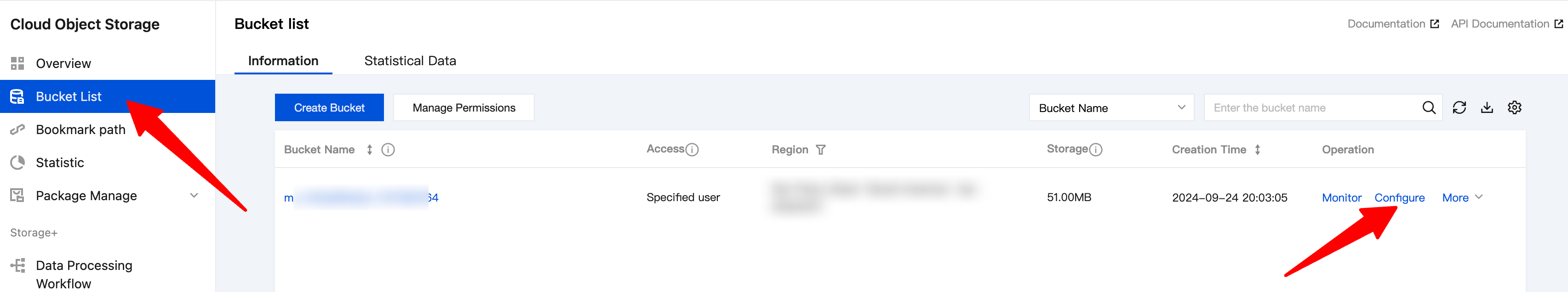 在 TCSAS 存储配置页面中,复制加速域名配置下方的“COS bucket”,再点击开通 COS 服务下面的“see details”,前往COS 控制台。 进入 COS 配置页面,点击左侧菜单“存储桶列表”,找到对应的存储桶( 可以使用上图中的 COS bucket 在右侧搜索框中搜索)。
