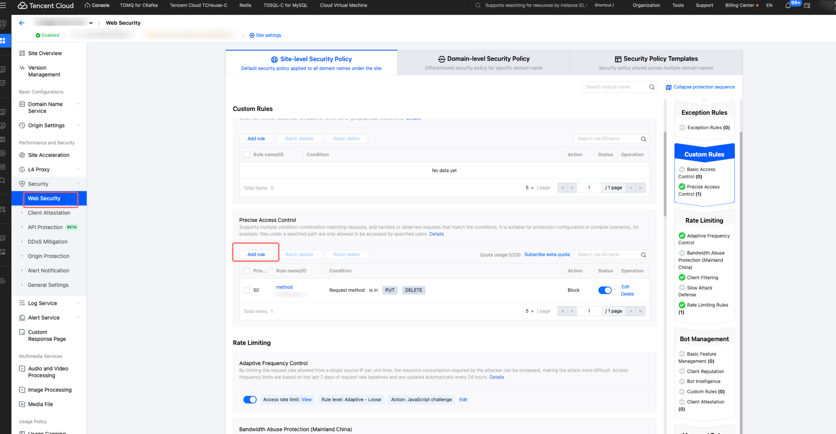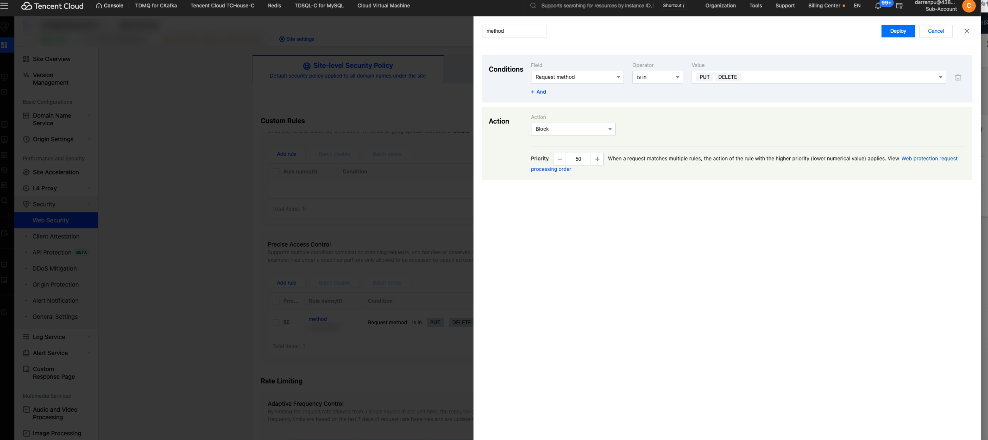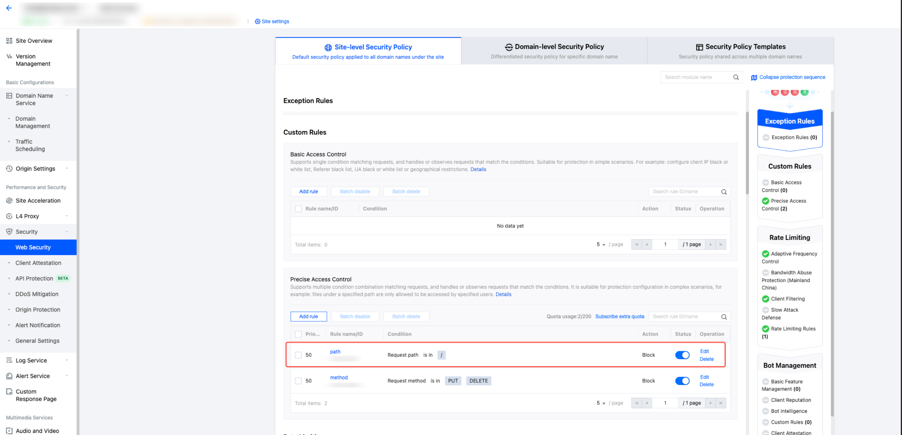 为保障您的数据安全,避免加速域名 PUT 及 DELETE 安全漏洞,我们建议您通过 EO 配置中的 web 防护对 PUT 和 DELETE 进行 block 操作。