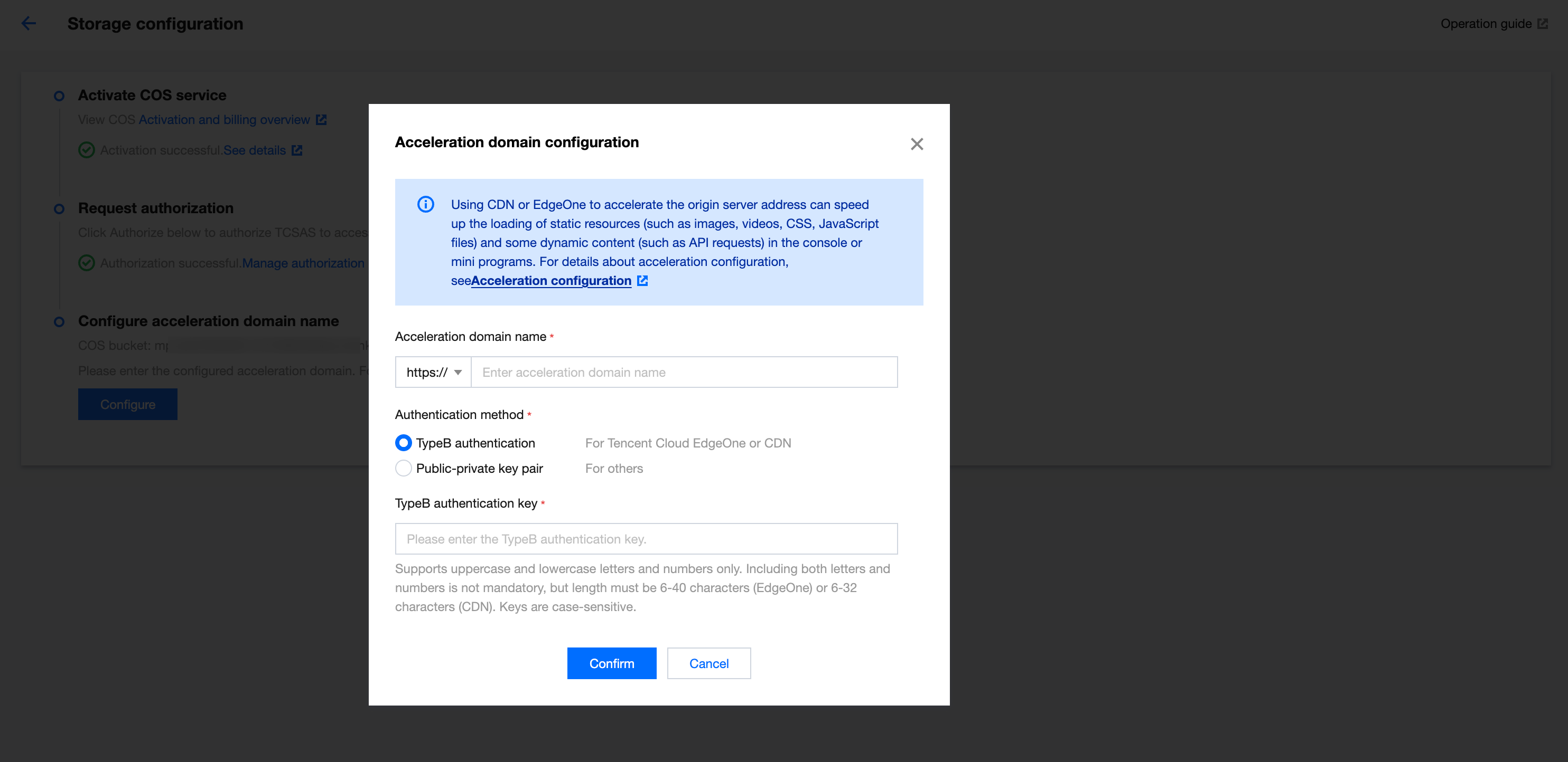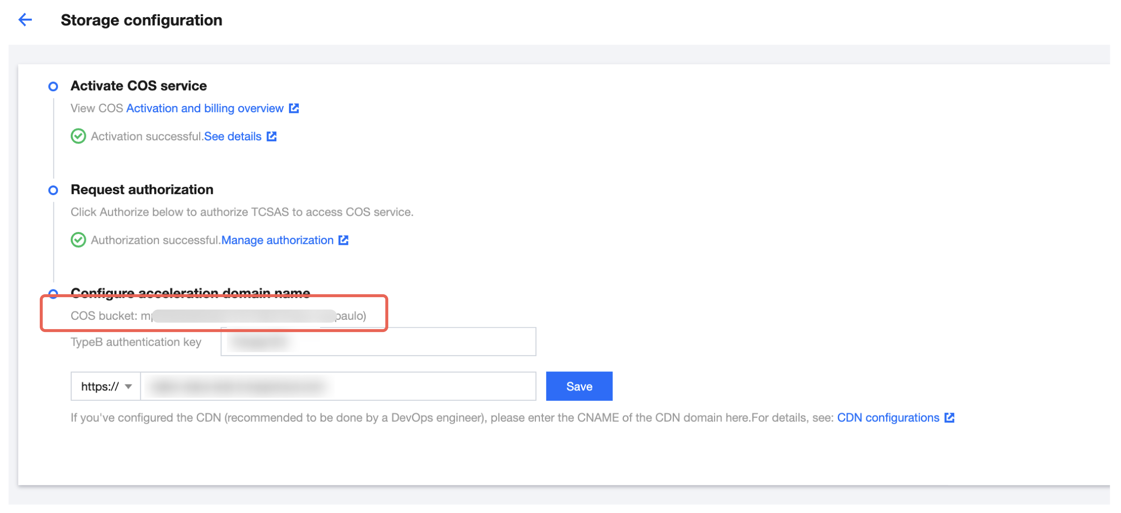 在完成域名添加和 TypeB 鉴权配置后,回到 TCSAS 存储配置页面,Acceleration domain name 填写添加好的域名,TypeB authentication key 填写上方 TypeB 鉴权配置中的“Primary Key”,点击保存后,等待系统测试,测试通过代表配置成功。