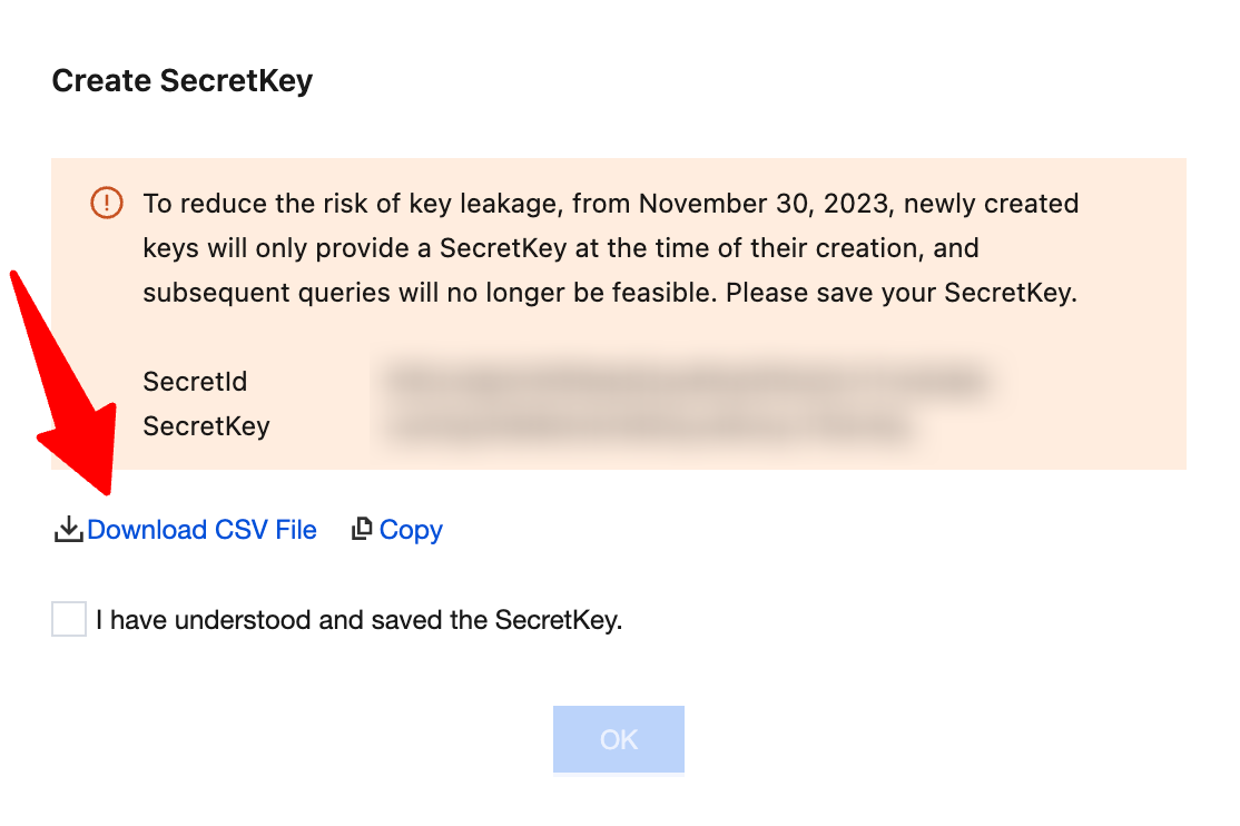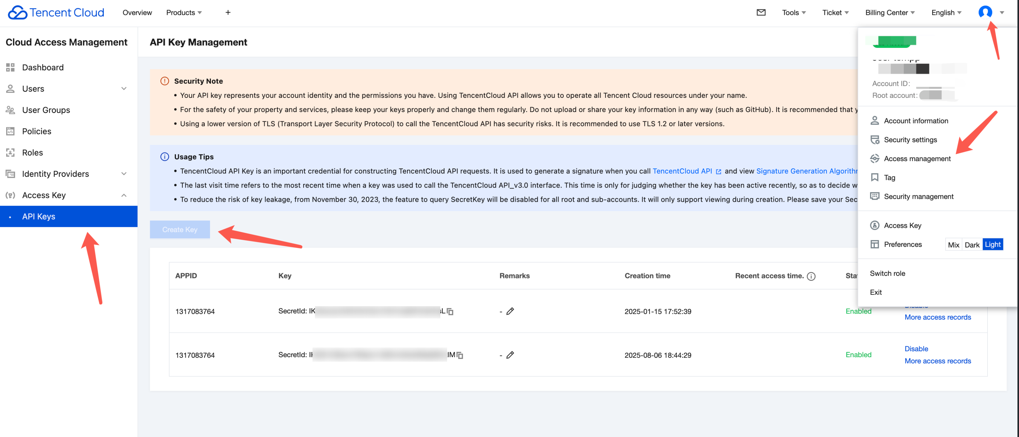 填写开通 COS 桶使用的腾讯云账号(购买 TCSAS 套餐的账号)下的 SecretKey 和 SecretId,在访问管理-API 密钥处获取。