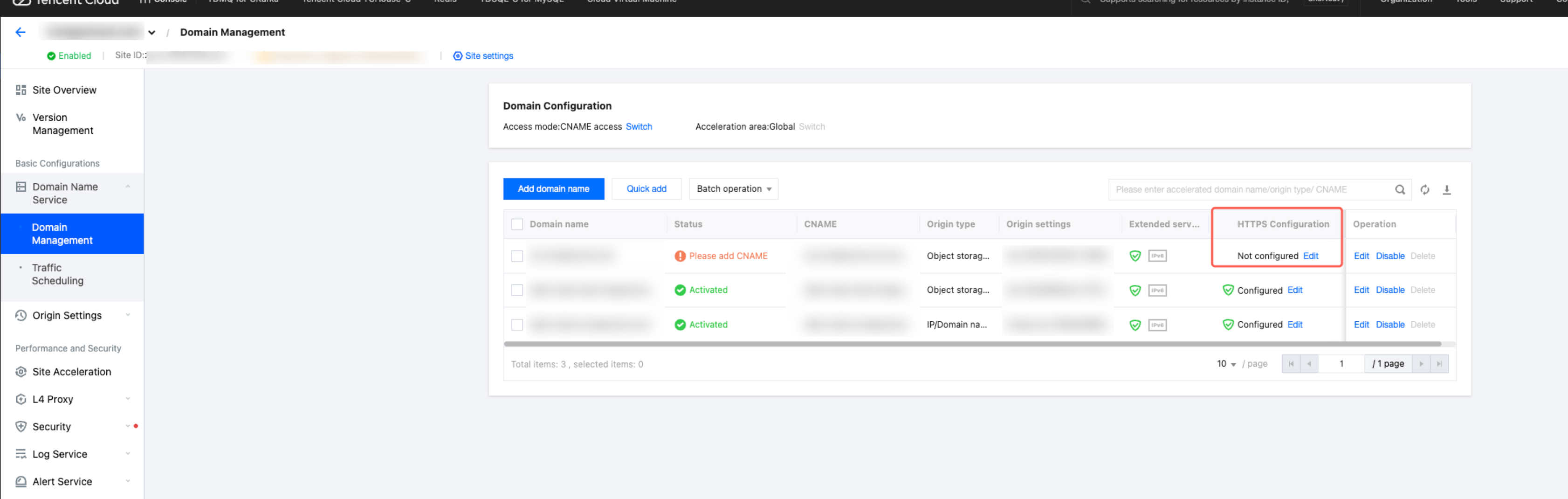 在添加域名之后,需要给域名配置 HTTPS 证书,在域名列表的 HTTPS Configuration 处点击“编辑”,按提示配置好 HTTPS 证书。