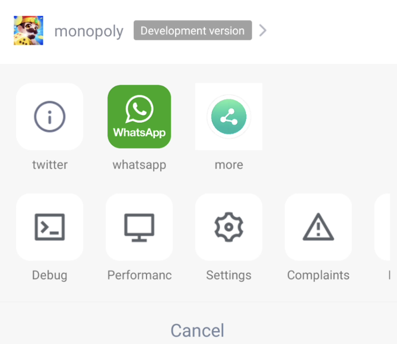 private static final String SHARE_TWITTER = "twitter";/*** 返回胶囊更多面板的按钮,扩展按钮的ID需要设置为[100, 200]这个区间中的值,否则,添加无效* 调用环境:子进程** @param miniAppContext 小程序运行环境(小程序进程,非主进程)* @param builder* @return*/@Overridepublic ArrayList<MoreItem> getMoreItems(IMiniAppContext miniAppContext, MoreItemList.Builder builder) {// 自行调整顺序。builder.addCustomShareItem(getString(miniAppContext, R.string.applet_mini_proxy_impl_other2),R.mipmap.mini_demo_about,ShareProxyImpl.OTHER_MORE_ITEM_2,SHARE_TWITTER, null).addCustomShareItem(getString(miniAppContext, R.string.applet_mini_proxy_impl_other3),R.drawable.tcmpp_demo_share_whatsapp,ShareProxyImpl.SHARE_TO_WHATSAPP,ShareProxyImpl.SHARE_TO_WHATSAPP_KEY, null).addCustomShareItem(getString(miniAppContext, R.string.applet_mini_proxy_impl_other4),R.drawable.tcmpp_demo_share_more,ShareProxyImpl.SHARE_TO_MORE,ShareProxyImpl.SHARE_TO_MORE_KEY, null);return super.getMoreItems(miniAppContext, builder);}