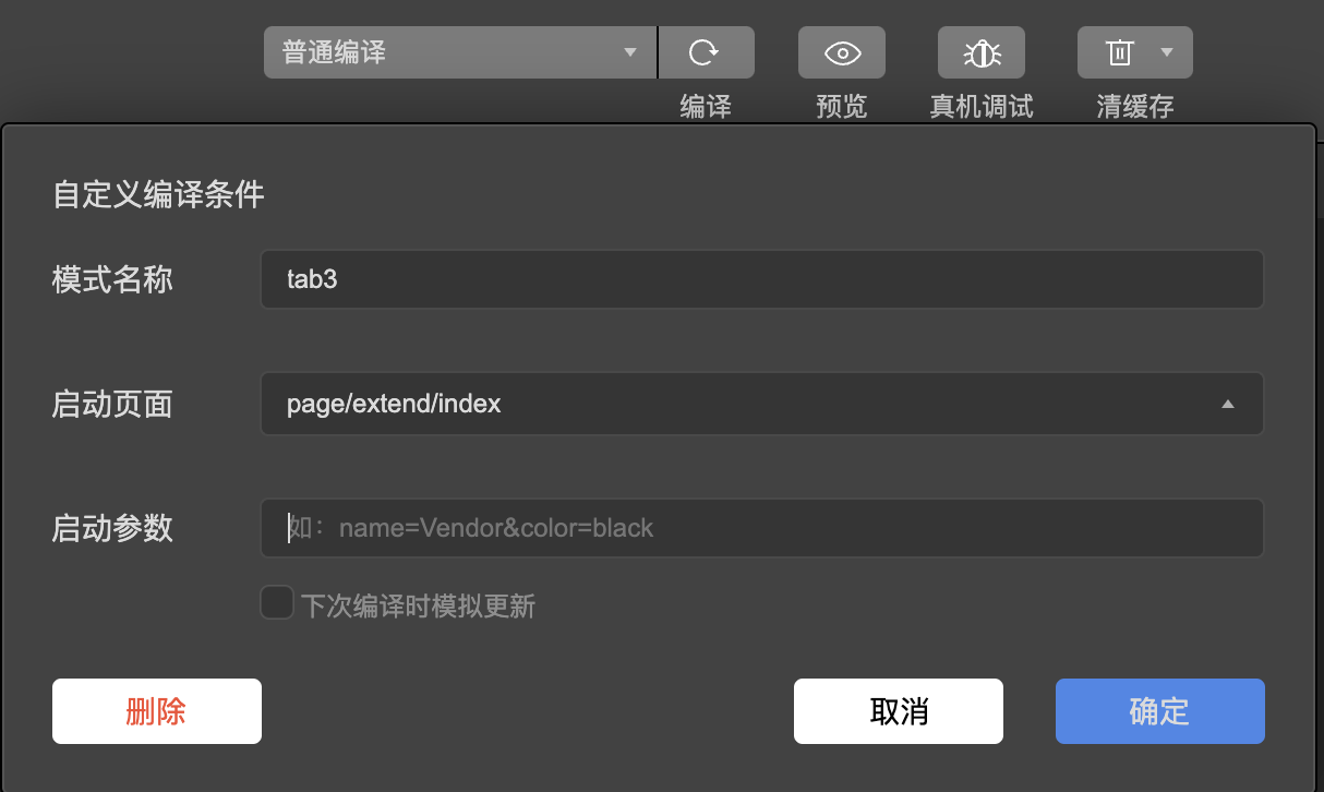 增加编译模式:可以快速打开指定页面,并且可以配置页面启动参数,该项配置生效以后会保存在项目project.config.json中,建议提交到git版本库,方便下次切换编译模式。