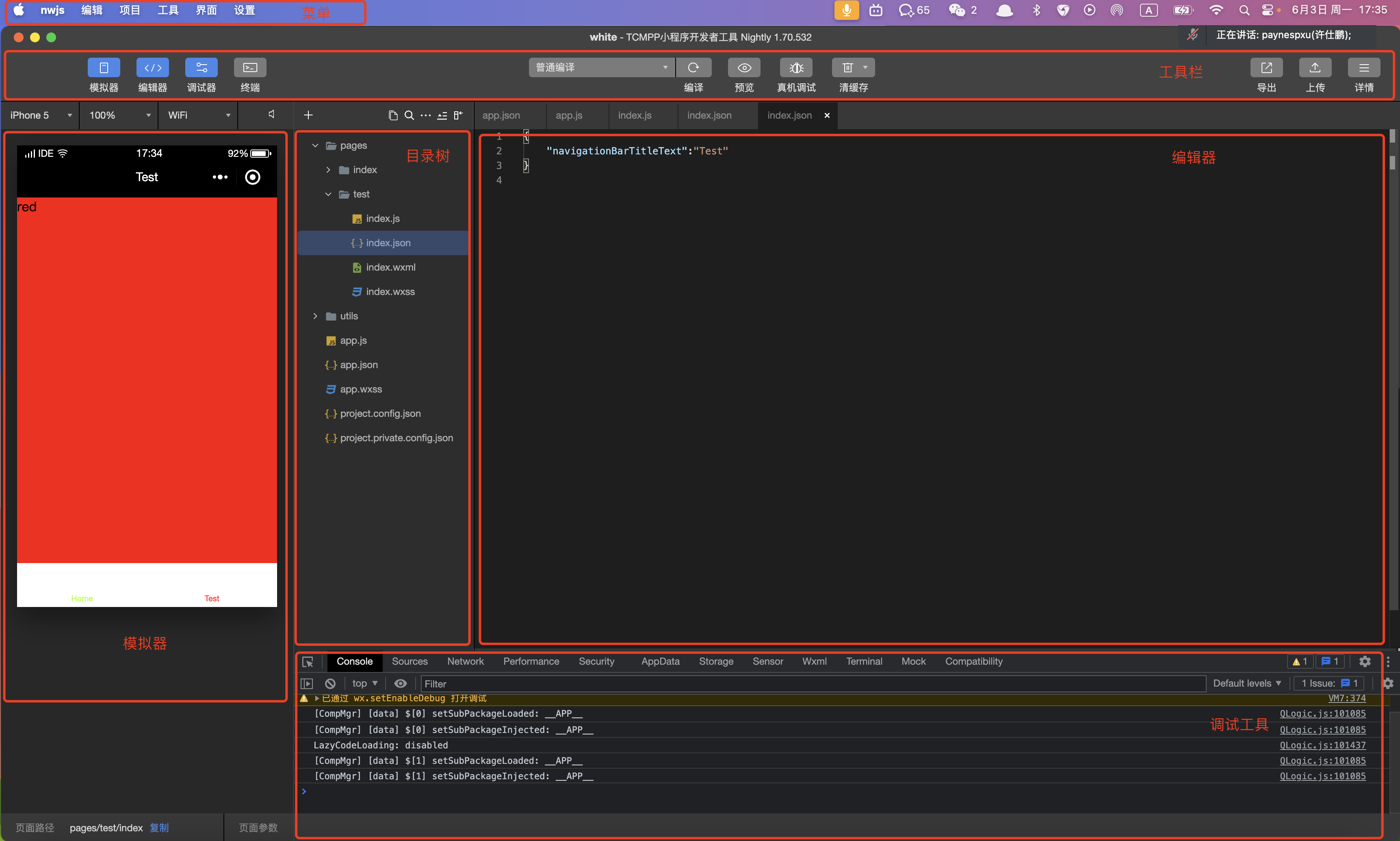 调试:调试开发则会工具,编辑器调试,如果遇到疑似开发者工具或者编辑器的bug,可以打开调试工具查看是否有出错日志,欢迎反馈问题。