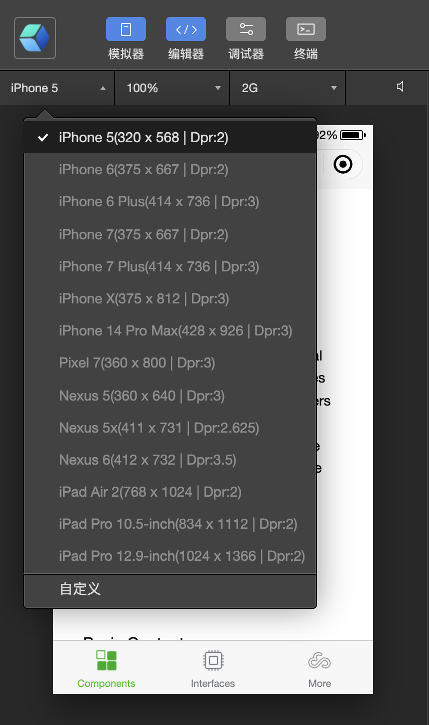 模拟器可以模拟小程序在客户端的表现。小程序的代码通过编译后可以在模拟器上直接运行。开发者可以选择不同的设备,也可以添加自定义设备来调试小程序在不同尺寸机型上的适配问题。