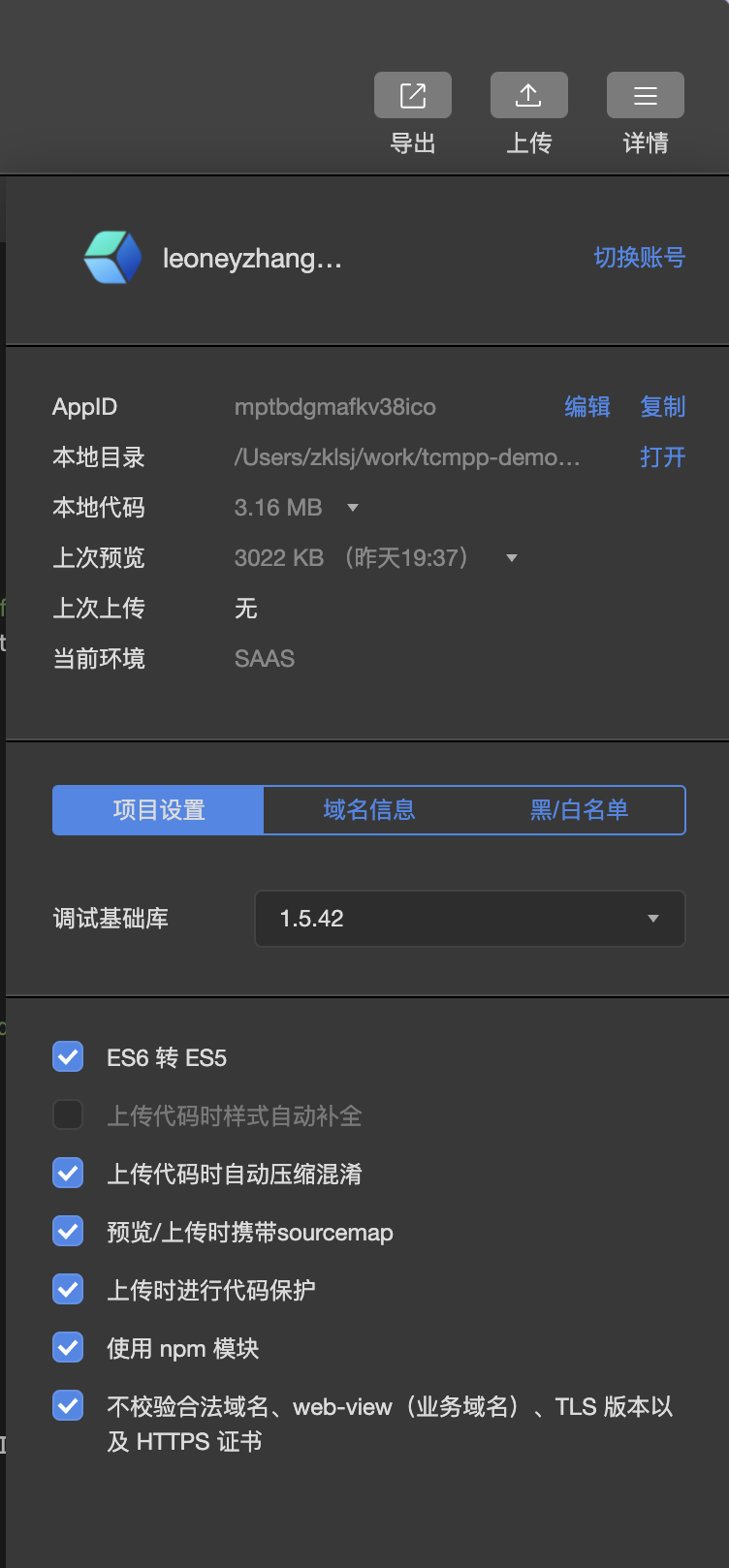 当前面板展示了小程序的基本信息,如 AppId,本地目录,本地代码大小、上次预览、上传信息以及当前环境信息。
