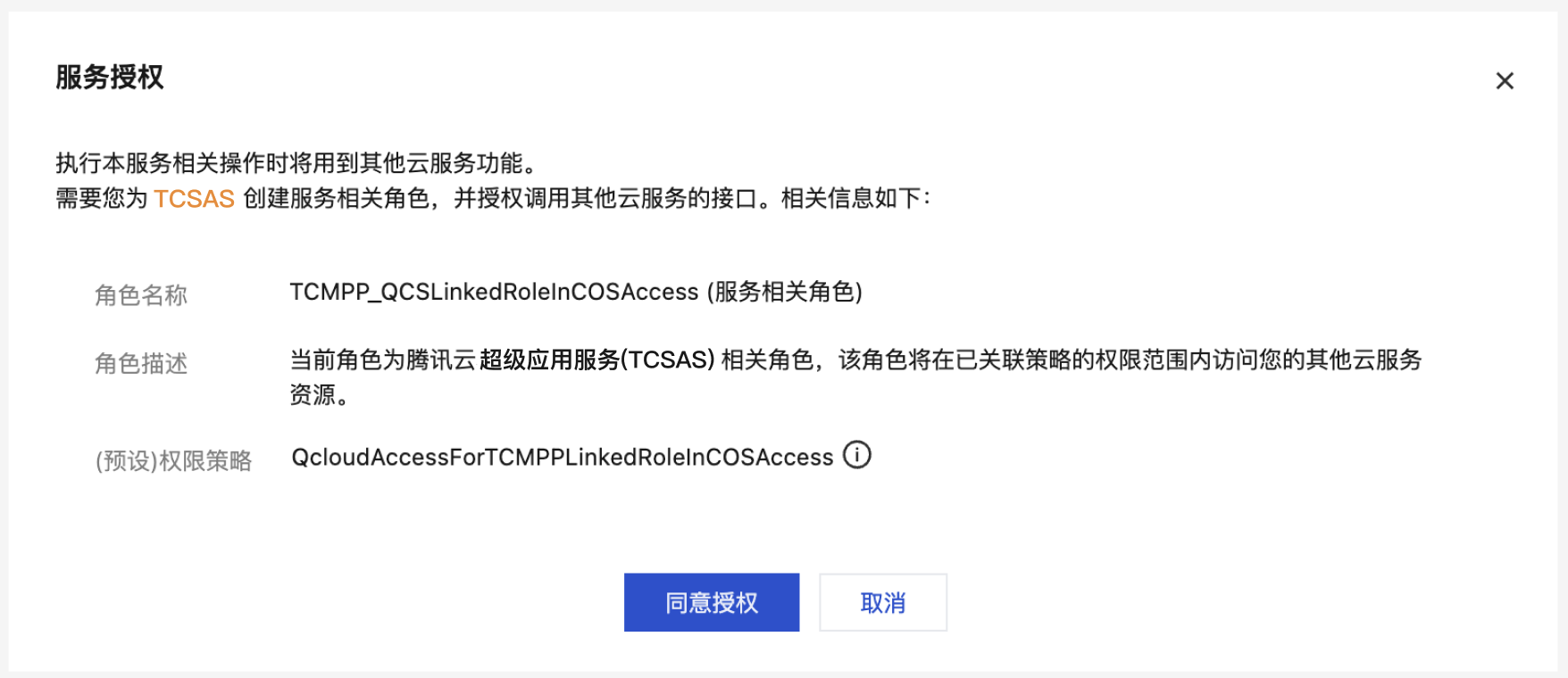 开通服务后,返回并刷新 TCSAS 页面,点击“服务授权”,在弹窗处,点击“同意授权”,即可完成存储配置。