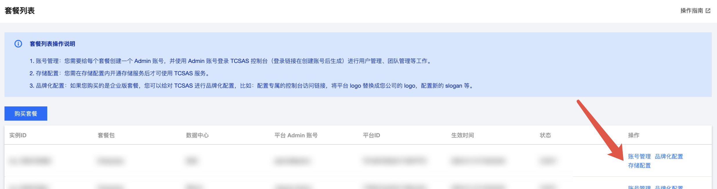 在套餐列表-操作,点击“存储配置”按钮,进入存储配置页面。