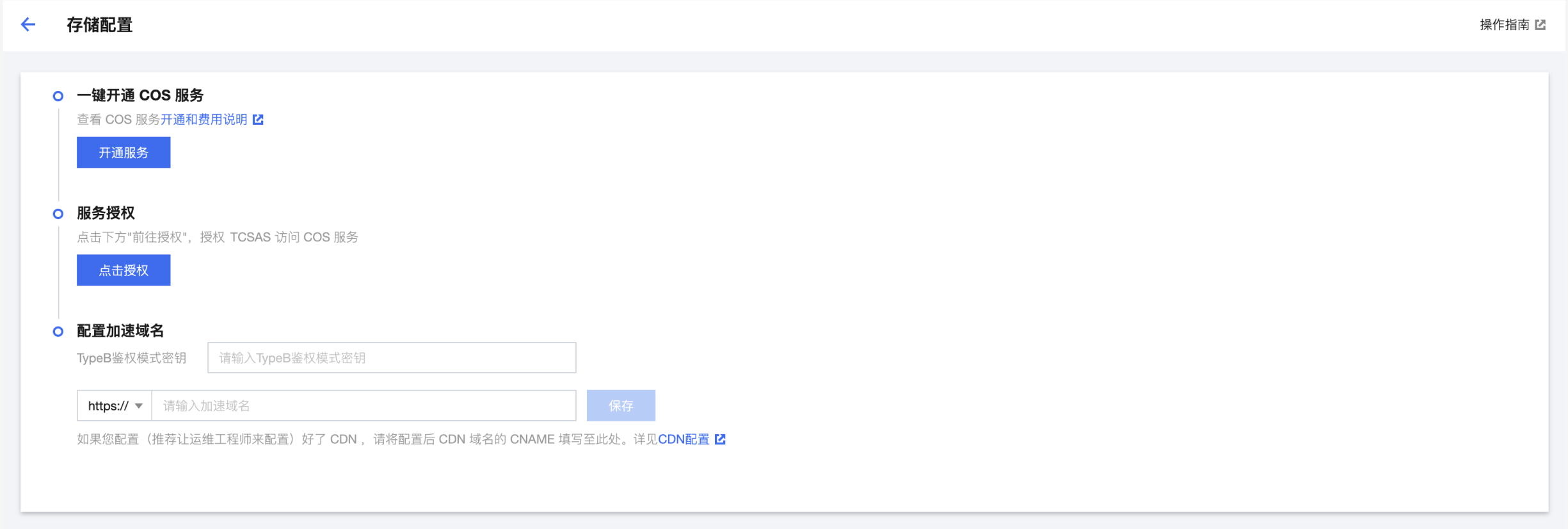 从 2.0.8 版本开始,在您购买了 TCSAS 套餐后,您需要在腾讯云控制台-TCSAS 套餐列表处,点击“存储配置”,开通存储服务并完成存储服务授权后,才可以正常使用 TCSAS 服务。