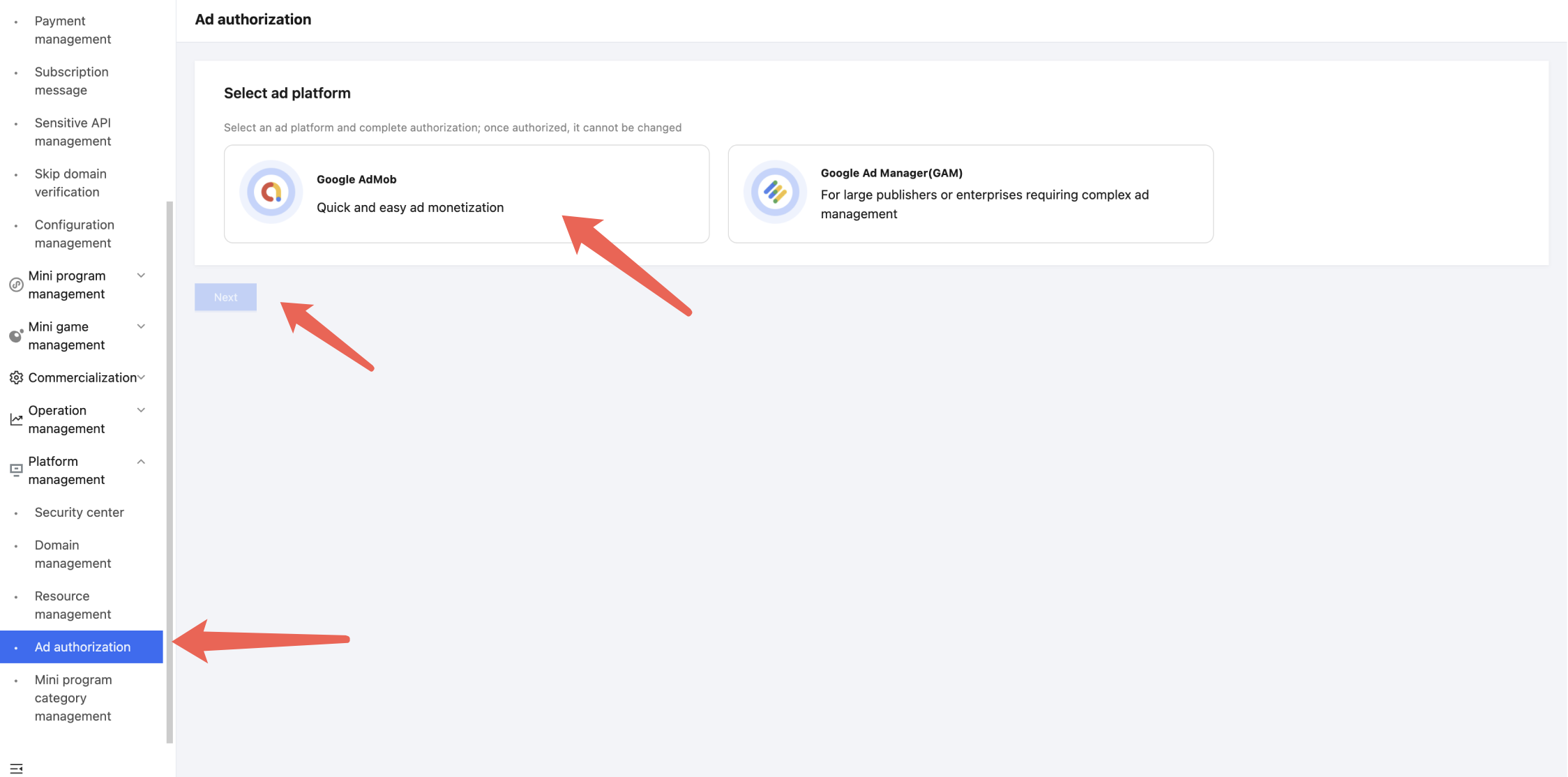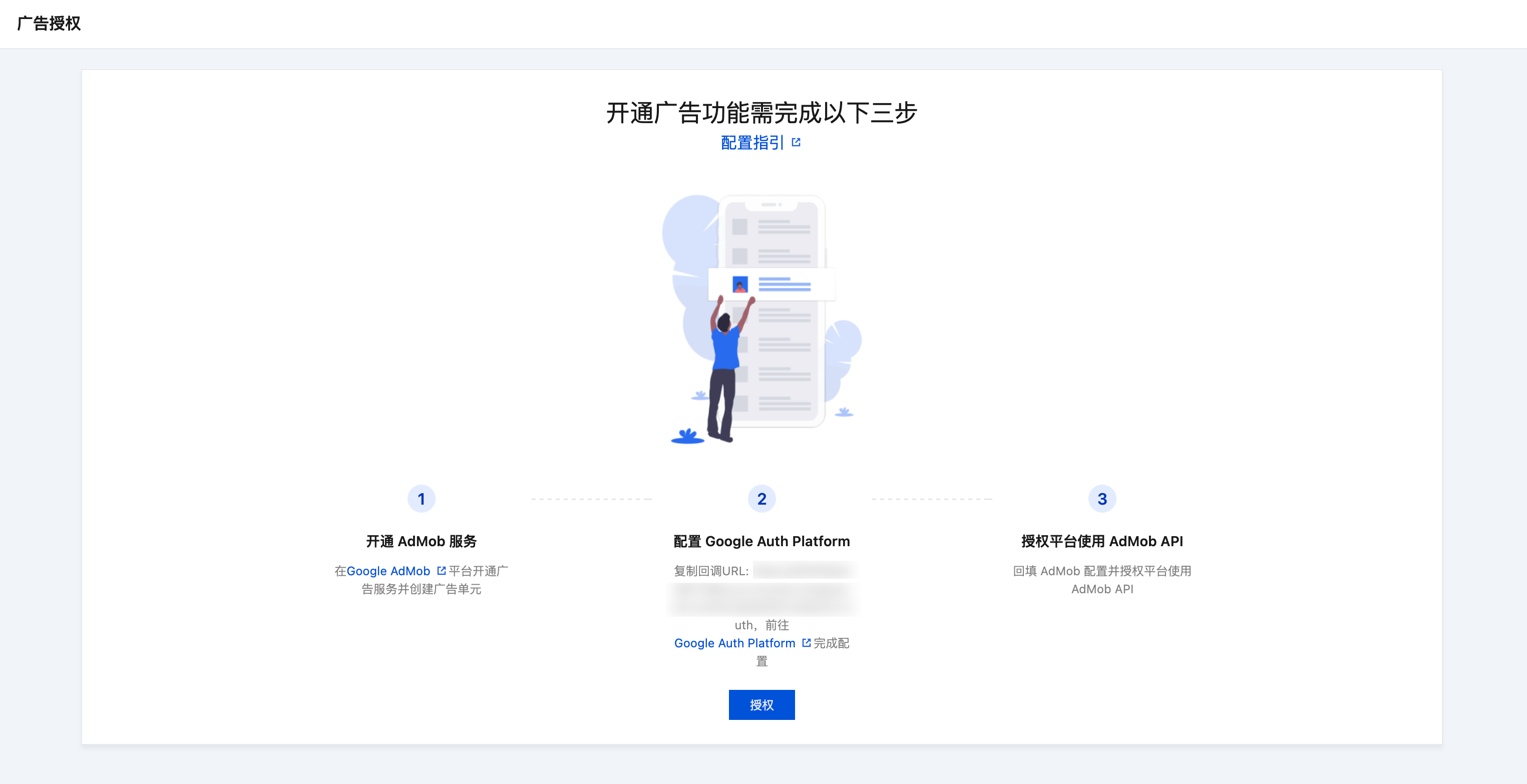 在您完成了前置流程的事项后,还需要进行广告授权,才能开启广告功能。