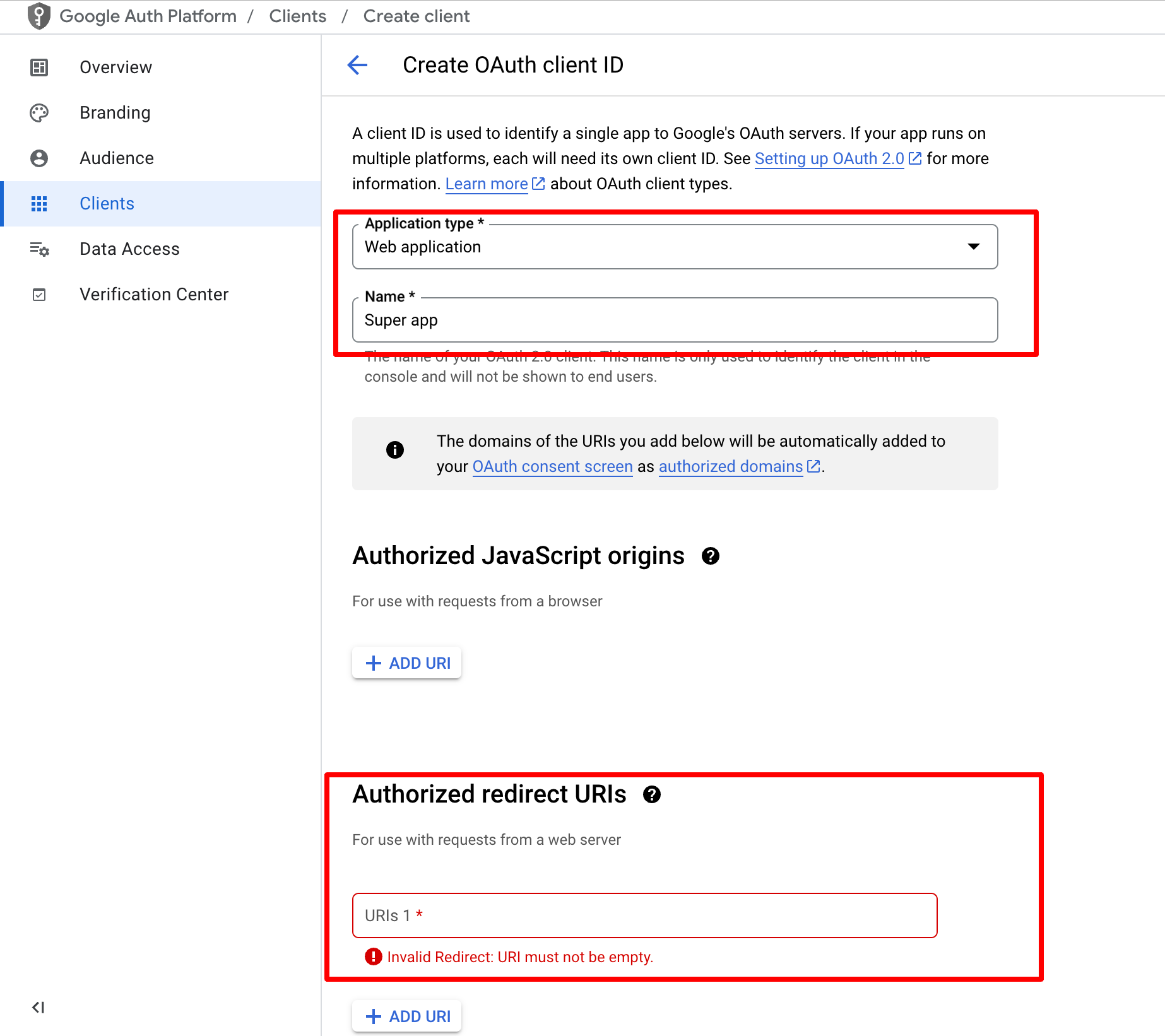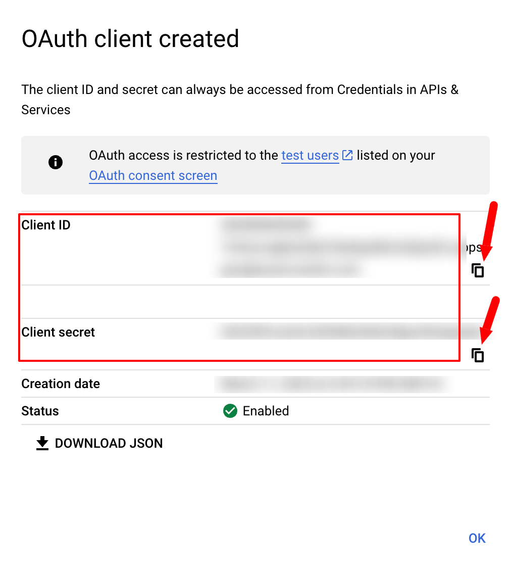 创建 OAuth client ID 后,复制 Client ID 和 Client secret 并保存(在下方授权流程中需要用到)。