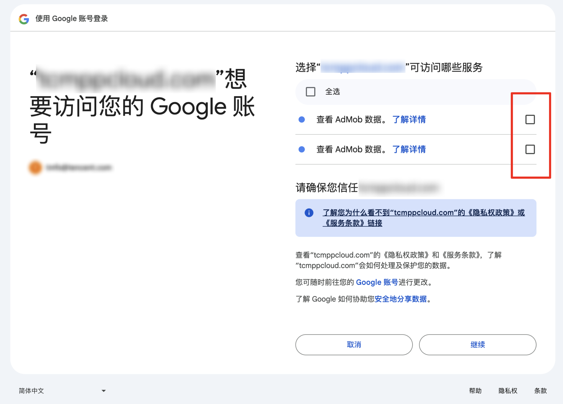 选择要授权给平台访问的服务(建议全部勾选),点击继续以完成授权。