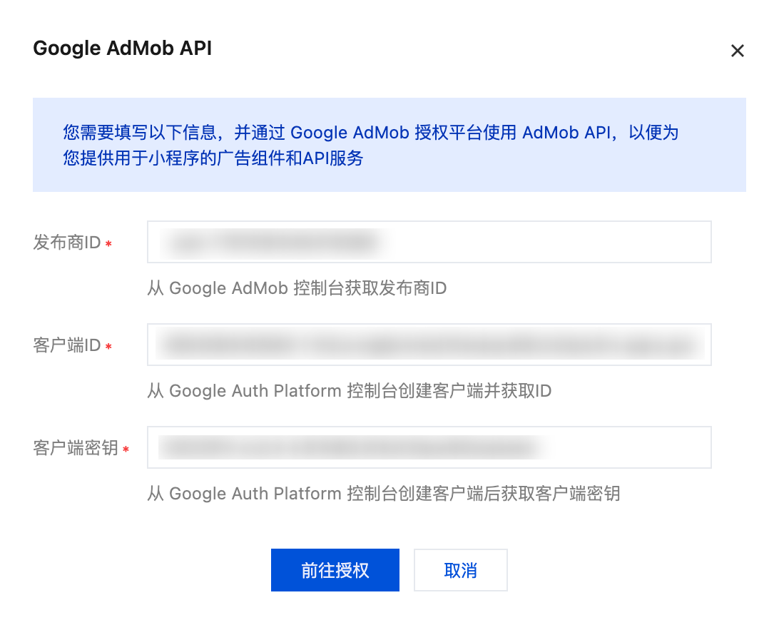 点击授权按钮,填写前置流程中提到的“发布商 ID、客户端 ID、客户端密钥”。