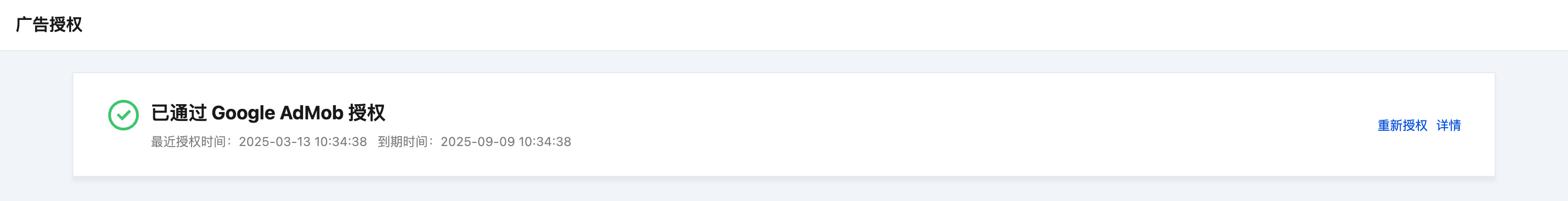 授权完成后,自动返回原页面,展示“已通过 Google AdMob 授权”的状态。