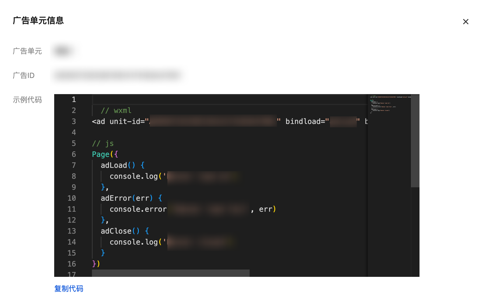 ,可复制示例代码,方便小程序或小游戏集成。