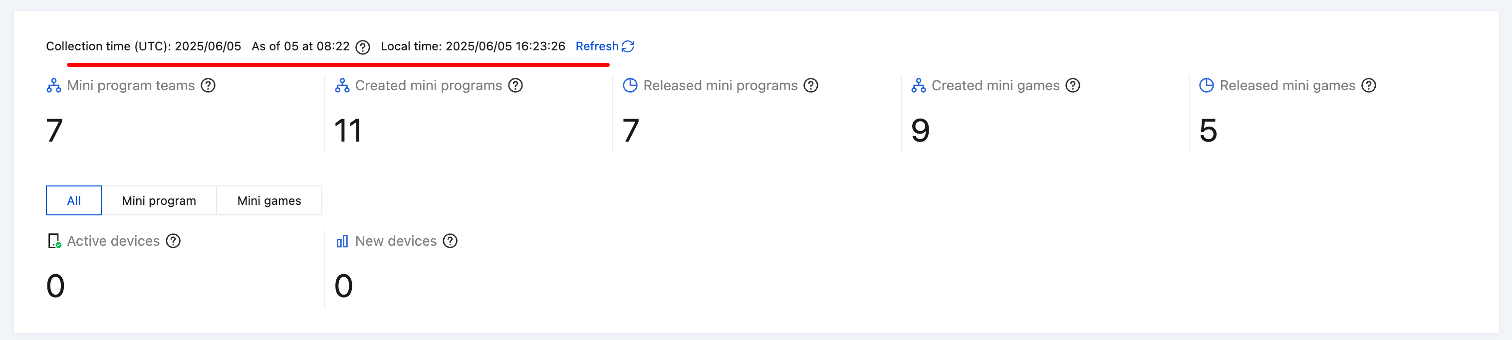 为了保障数据统计的准确性,我们采用 UTC 时间(世界标准时间)来统计数据,数据每半个小时统计一次,刷新数据时,返回的数据为最近一次统计数据,非实时数据。