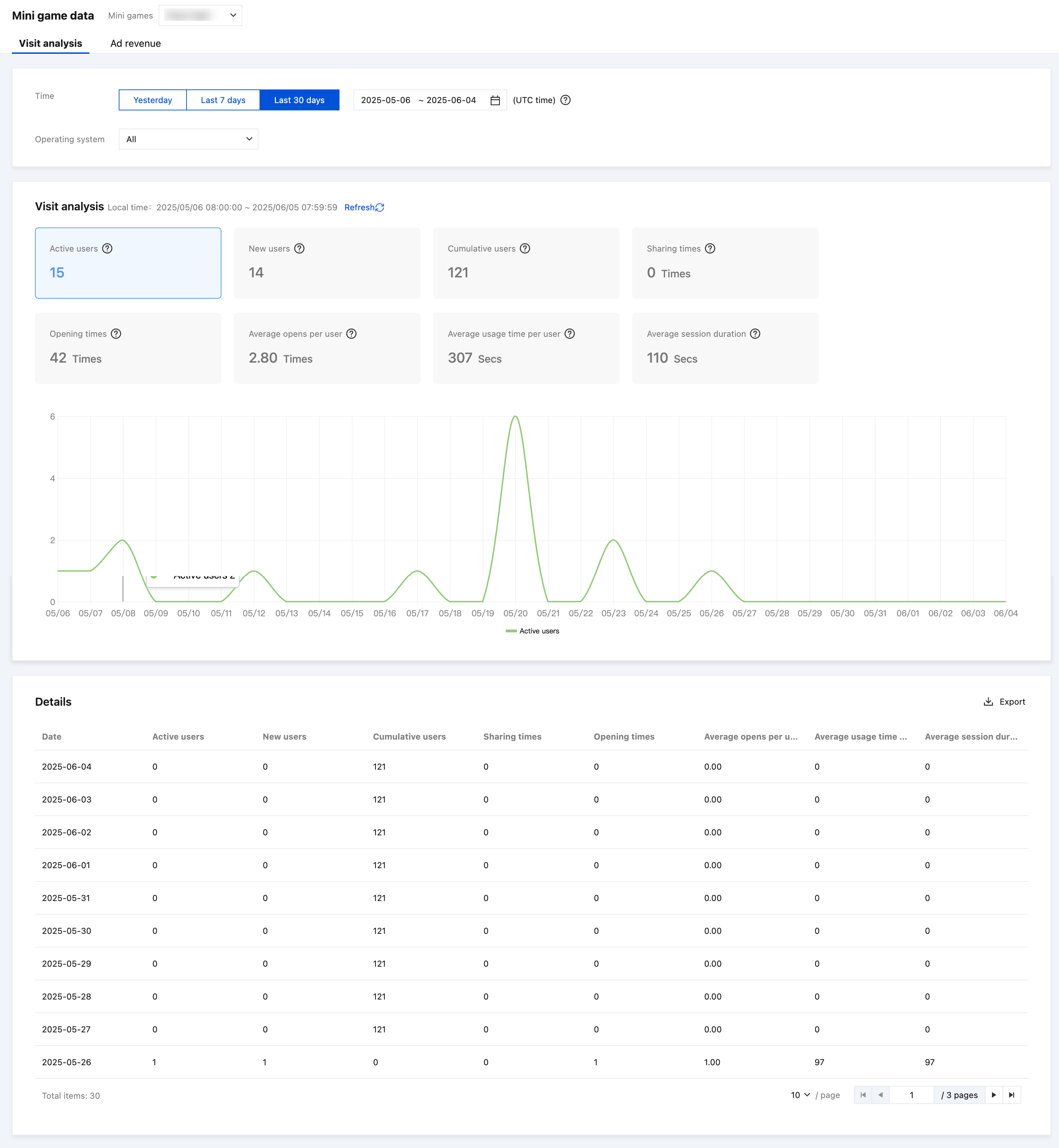 活跃用户数 | 访问小游戏页面(进入小游戏)的用户数,同一用户多次访问不重复计。 |