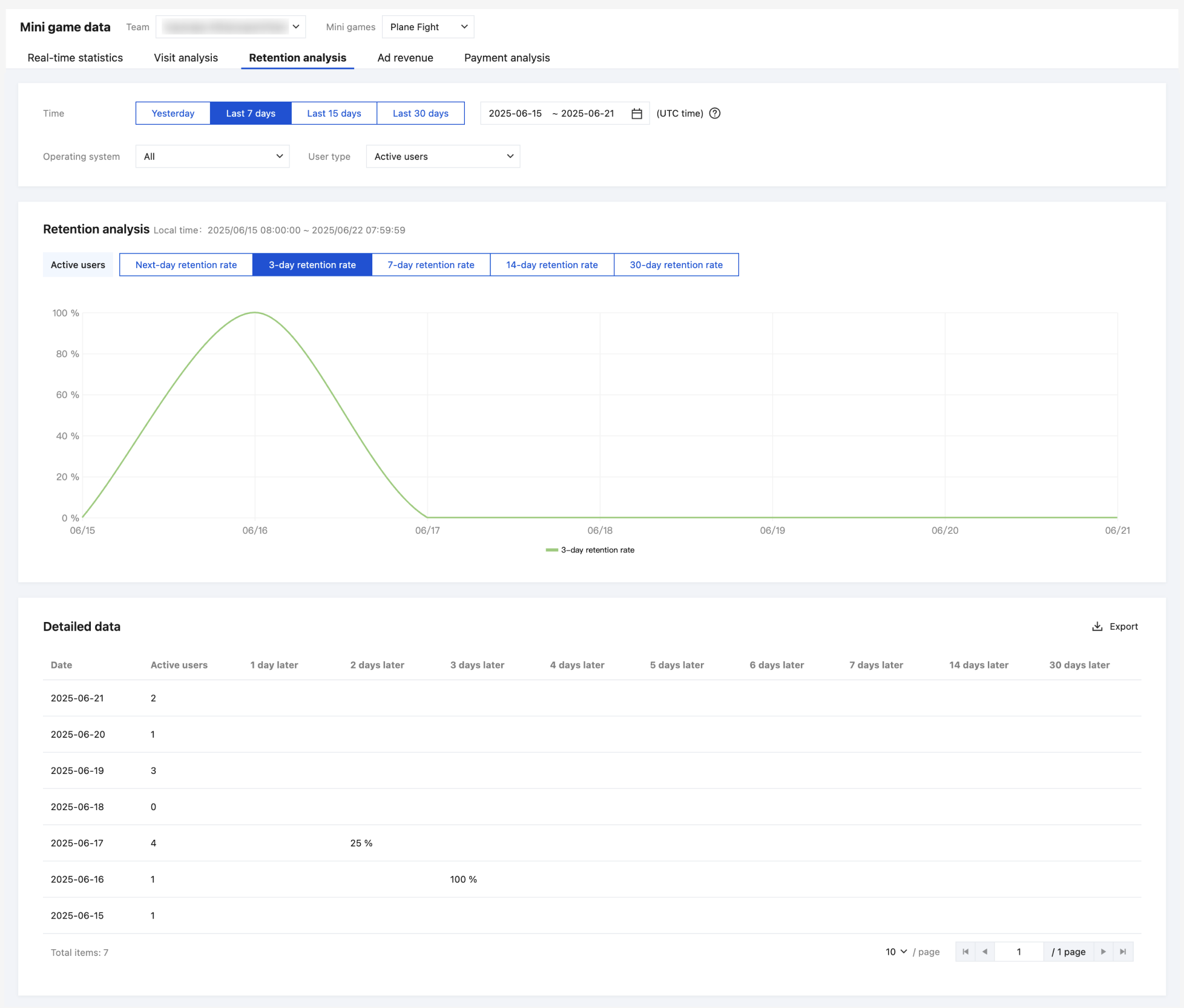 7 日留存率 | 日期当天(或所选日期范围内每天)的新增用户(或活跃用户),在次 7 日又继续使用的比例 |